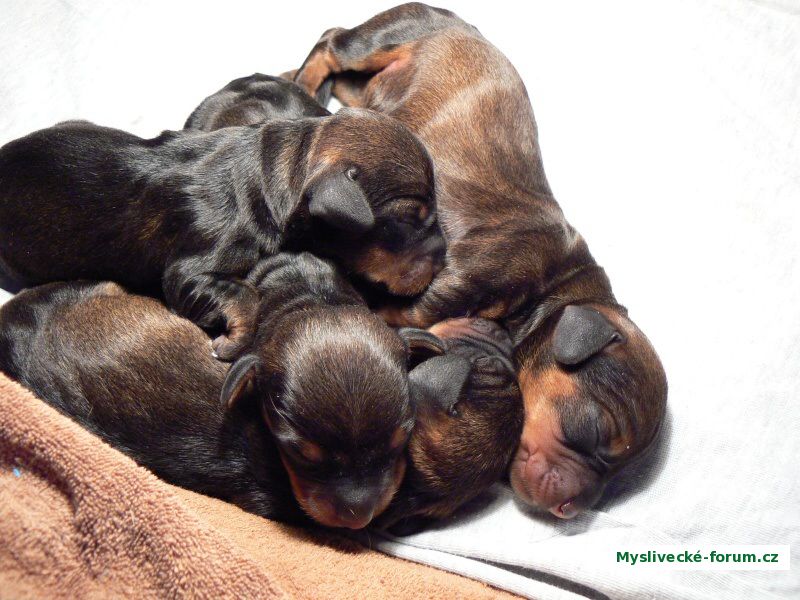 Pavle, díky za přání, ale lovci z nich nejspíše nebudou. Představ si, že jeden pejsek a fenka mají malou bílou náprsenku! Kde se to v genech vzalo...Rodiče mé fenky a psa, který kryl, znám, samí fon, asi se mi Ája někde ještě spustila s kuňákem skalním :-):-):-)/pokus o vtip, já vím, blbý/.