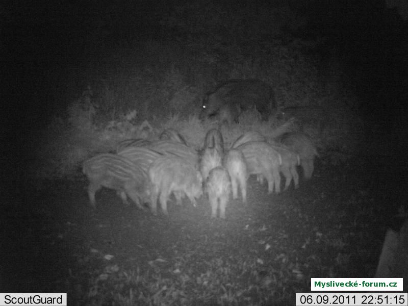 Chodí sem kolegovi na lesní vnadiště přes 15 selat a 4 větší kusy a poměrně pravidelně. Ale na vnadiště v poli už to přestává chodit, protože začínají se nalévat klasy pšenice, a to je pak po vnadění, a může jim tam člověk nosit co chce, ani na kukuřičku nechtějí slyšet :-).