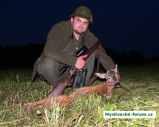 Hlavně zachovat klid a nikam nepospíchat. Beru telefon a volám kolegovi, který sedí kilometr ode mě. Úkol zněl jasně :-) vydrž já za tebou přijedu. Tak čekám a čekám. V hlavě se mi promítají ty chvilky před výstřelem. Už nemohu dál sedět. Jdu se projít, abych se uklidnil. V tom už vidím kolegu, tak spěchám honem na nástřel. Srnec ještě odskočil 5 metrů, kde ve vysoké trávě na hraně lesa zhasl. Stojím nad srnce, smekám klobouk a v hlavě si opět promítám průběh lovu. Pomalu se stmívá, a tak srnce vytahuji na louku, v tom už kolega přichází s úlomky. Následuje předání posledního hryzu a gratulace k prvnímu ulovenému srnci. Úlomek umísťuji za klobouk. Plomba a hurá do vyvrhování. O komárech se nemá asi cenu zmiňovat, to zná každý.
