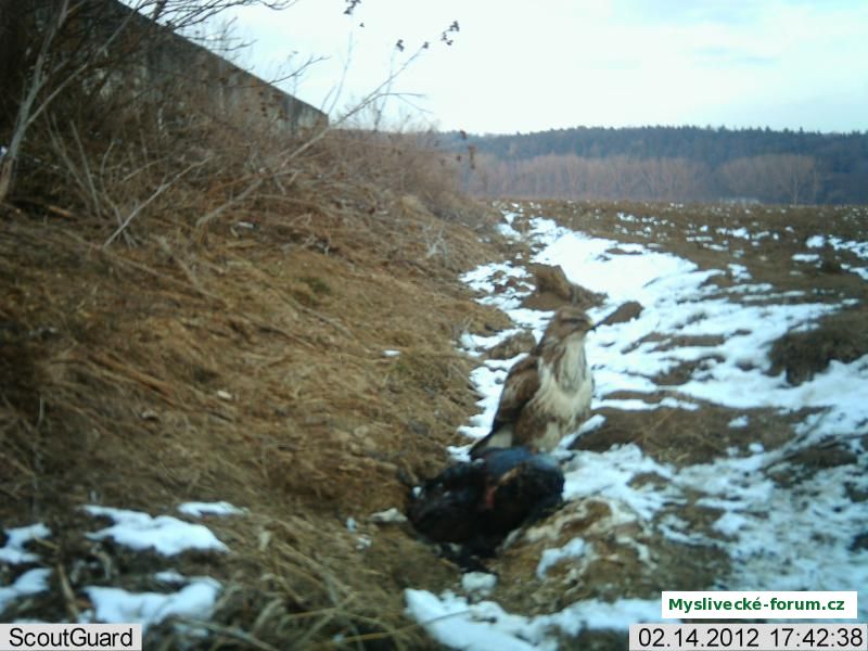 Hodně světlé káně. To je taková nelovecká újeď - spíše přikrmování dravců a lišek ze zbytků ze zabíjaček a tak, jsou to patrně vnitřnosti asi z domácího prasete přikryté hlínou, které po roztání sněhu takhle zčernaly. Není to v mé režiji, je u toho jen moje fotopast, já bych to přikryl větší vrstvou hlíny, aby to nebylo tak na očích - no ono to na očích teda není, ale taky aby to lépe na fotkách vypadalo.