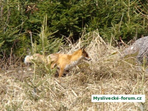 Ještě ze včerejška.Její Veličenstvo je po zimním marodění v invalidním důchodu,zlobí ji záda a už nebude tak běhat jako dřív.Když zaregistrovala lišku rozeběhla se zaní.Liška se k mému údivu nedala na útěk,ale šla se podívat co se to zaní hrabe.Škoda,že mi nějak nedošlo (polá reakce staršího pána)přepnout foták na video.