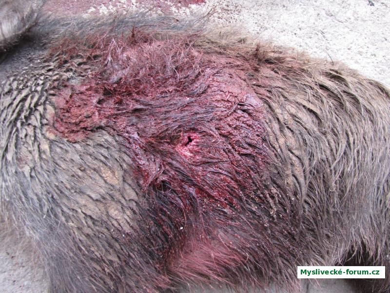 Dnes jsem ulovil s tímto střelivem první kus - divočák 65 kg :-) odešel od nástřelu 100 m, střeleno na zadní komoru, zásah plic, játra nezasažena. Foto výstřelové strany.