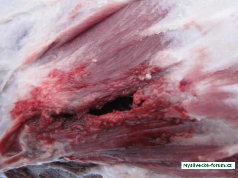 Dírky akorát, pěkně vidět dovnitř, když jsem na ležící kus prvotně šáhl, vystříkl přímo pramen barvy, proto to velice dobře barvilo velkými kapkami. S SPCE se mi poslední rok velice často - alespoň u poloviny případu - stávalo, že byla tkáň z vnitřku vytažené ven a proto kapičky byli drobné nebo byl výstřel ucpán úplně a pak to nebarvilo vůbec. Je to po první zkušenosti tvrdší střela než SPCE. Uvidíme dál, jak to bude vypadat, za nedlouho snad i na srnčím.