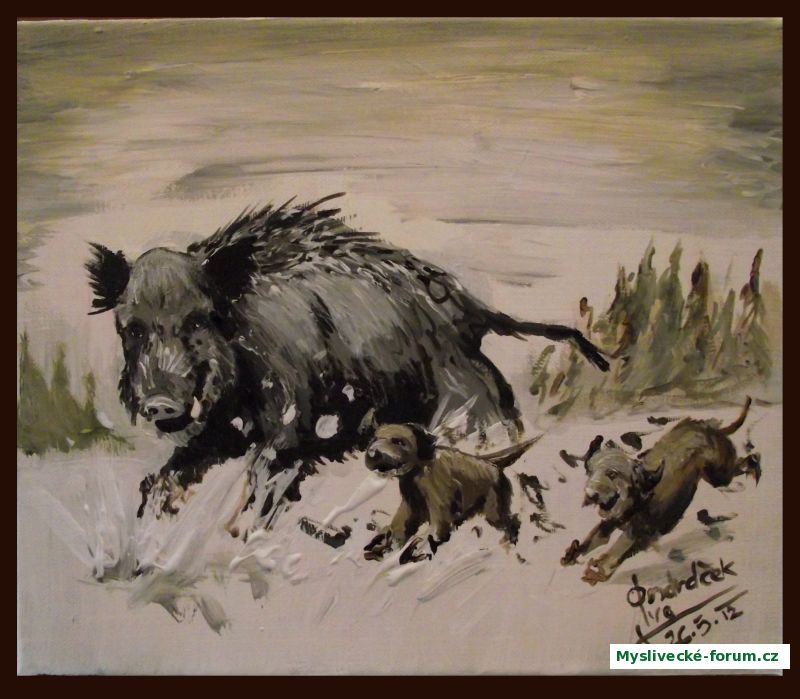 Eriko, teď přesně cituješ původní objednávku. Tohle je totiž na motivy jedné zakázky. Bohužel budoucího majitele postihly nesnáze, takže k samotné ostré malbě nedošlo, tož dopadla jen tahle skica. Pošli mi fotky a namaluju ti co hrdlo ráčí..:)