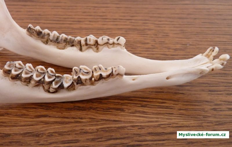 Opotřebení odpovídá pěti rokům, ale M1 v obou spodních čelistech jsou uvolněné, pokleslé a vybočené. Pravá horní M1 také ve špatném stavu. Kořeny stoliček všeobecně obnažené. Věk tedy odhaduji na 6+. No a předek lebky stojí za samostatnou fotku.
