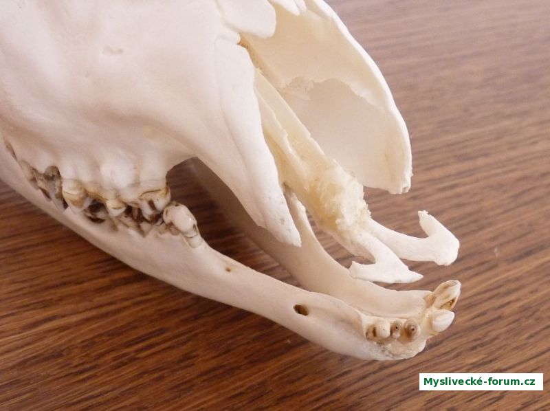 Rone, tuto možnost vylučuji. Všimni si, že kůstky patra jsou zlomené a v lomu vytočené nahoru po nárazu zepředu. Nosní kůstky byly rozlámané a spolu s chrupavkami tvořily jakousi vazivovou hmotu. Po vyvaření jsem marně hledal většinu kůstek i v nosní dutině. Byly rozměklé. Ostatně celá lebka je hodně odvápněná. Na to, jak ten srnec vypadal, dal ještě docela dost stavebního materiálu do trofeje.