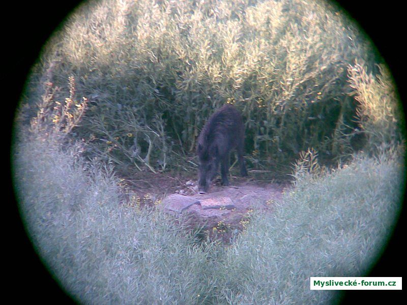 Přišel mi na vnadiště v řepce dnes ráno v 4:30,vystrčil pouze ryj z řepky a hned zmizel zpět.Doufal jsem že chuť na kukuřičku bude silnější a přitáhne ho znovu.A taky že jo.V 5:00 už byl zase na place,ale celé vnadiště si napřed obešel,aby se ujistil,že je vše OK.Tak jsem ho tam "pásl" celou hodinu,střapec nebyl vidět a že je to kňourek jsem s jistotou poznal až se otočil zadkem.Tipl jse mu tak kolem 60kilo,nakonec u mě dostal zelenou,jestli takové štěstí bude mít až přijde někomu jinému.......