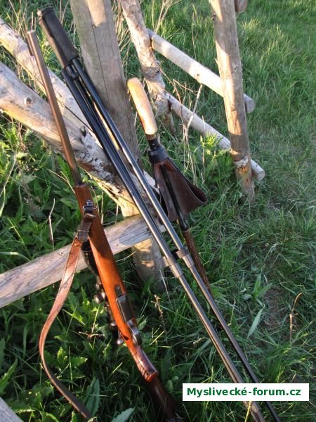 Flinta, trojnožka, myslivecká hůl + dalekohled a foťák.