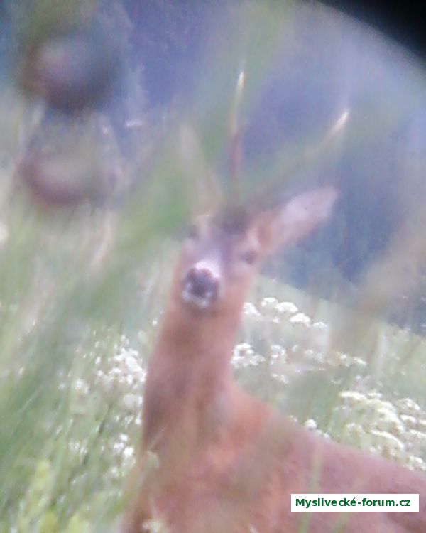Tak já vám k tomu dopíšu ještě zbytek informací. Je to vidlák, přední výsady dlouhé max 3 cm. Růže jsou zcela malinké a nevýrazné. Napřed jsem začal okamžitě rovnat trojnožku a chystat flintu. Takhle zepředu vypadal jako průběrný srnec 4+. Pak jsem se zarazil, protože se mi něco výrazně nepozdávalo. Seděl jsem na mezi, on na mě občas "mrknul" a protože byl zvědavý, pásl se směrem ke mně. Zastavil se až na 6 metrů:)