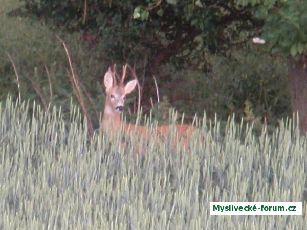Srnec vytáhl z řepky na kraj pšenice, nejdřív chtěl jít dál ale pak navětřil zalehlého špičáka (velmi dobrý roček) a prohnal ho asi 100m, pak šel zpátky za mnou :-) Nakonec se vrátil do lesa.