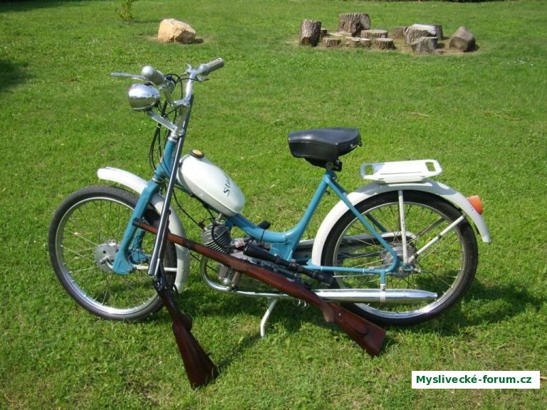 Přestříkat na zeleno, mezi řidítka namontovat opěrku na flintu, přimontovat dětská bezpečnostní kolečka aby to nepadalo na stranu a člověk nemusí ani slézat. Prostě zaparkovat v rohu louky a zůstat sedět na stroji, dokud zvěř nedorazí...:)