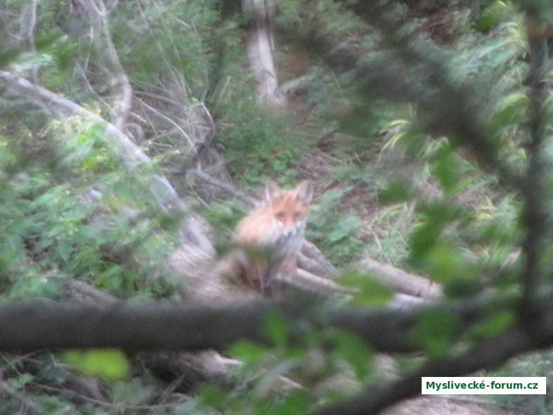 Po chybení lišky z předchozí fotografie jsem se byl podívat na nástřel, ani kapka barvy, a liška seděla v zarostlém potoce na kládě v průseku za rybníkem a čuměla, jak ta trubka, co ju o chvilku předtím netrefila, hledá nástřel :-). Zkoušel jsem mířit i podruhé, ale v cestě byla větev, tak pro tentokrát vyhrála.