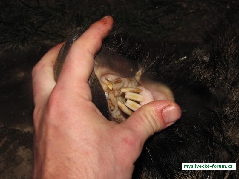 Řezáky divočáka, kterého jsem ulovil minulou sobotu - kňourek, 13.-14. měsíců, živá váha jen 40 kg. Takže tento už lončákem byl tak i tak :-).