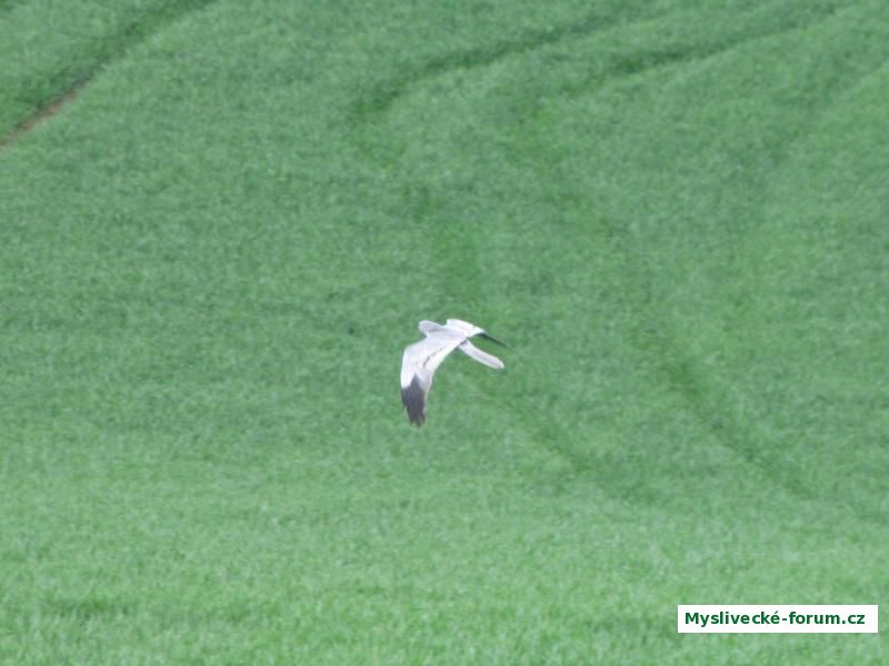 Je to foceno z normální pětimetrové kazatelny, kterou ve svých vyprávění nazývám "na křižovatce". Ono je to mírně z kopečká k "mé" kazatelně a pak zase mírně do kopečka na horizont, a ten moták prolétává právě tou sníženinou mezi kazatelnami. Asi seděl před těmi 14 dny někde v obilí, tak jsme se vzájemně neviděli a když jsem tam seděl a hledal v té pšenici ležící srnce, tak kousek od kazatelny vzlétl (ale tohle už je foceno kolem 120 metrů daleko).