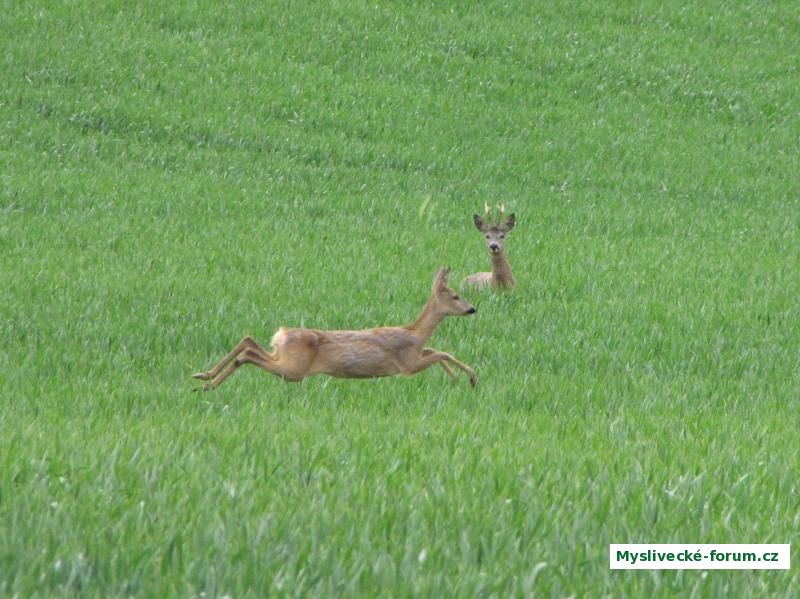 Srna na útěku, srnec si to zatím rozmýšlí.