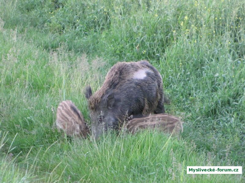 Dnešní bachyně se selaty. Je ten flek znak prašiviny nebo ne? V životě jsem to u divočáků neviděl.