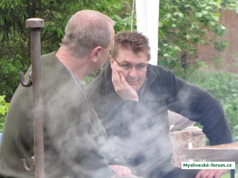 Jarda přemýšlí,jak vylepšit kvalitu pečených kýtiček!Až se z něho kouří...Roman intenzivně dumá o radách "pana vedoucího"!:-)