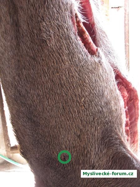 Divočák z minulého pondělí. Vstřel v kroužku těsně za lopatkou, první výstřel normální na druhé straně na žebrech, patrně druhý výstřel na stejné straně jako vstřel dole na břichu (ta velká díra v horní části) byla ucpaná střevy, střeva nebyla proděravěná.