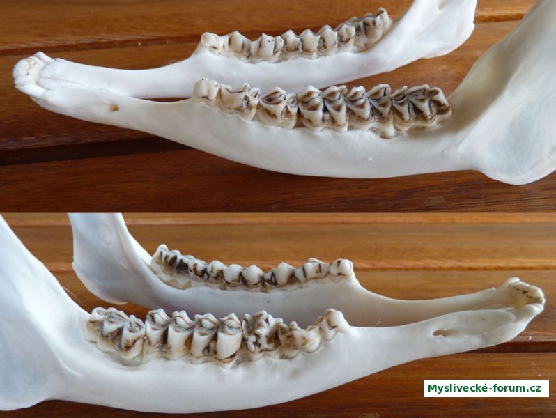 Honzo, dvouletý rozhodně není, na levé straně už je hodně dotčená výška korunek. Některé zuby napravo se pro křivé postavení téměř nedotýkaly s horními. Je tam velký posun opotřebení od premolárů k molárům, takže na M trojkách jsou i na vnitřní straně sjeté hrany. Mám ověřeno, že kus, kterému se z jakéhokoliv důvodu špatně přežvykuje, má vždy menší opotřebení. Ale 5 let, jak jsme ho s Matějem i hospodářem napoprvé odhadli, určitě nemá. Na "obličejovou" kresbu se začátkem srpna už spoléhat nedá, ale co mě asi nejvíc zmátlo, je šikmé postavení růží. S tím jsem se zatím setkal jen u trojek. A pak regrese výsad a hmota dole. Při první prohlídce po ulovení pak opotřebení řezáků, a hospodář nařízl zrovna tu levou stranu... Holt jsme věční adjunkti, jak tu kdysi kdosi psal :-)