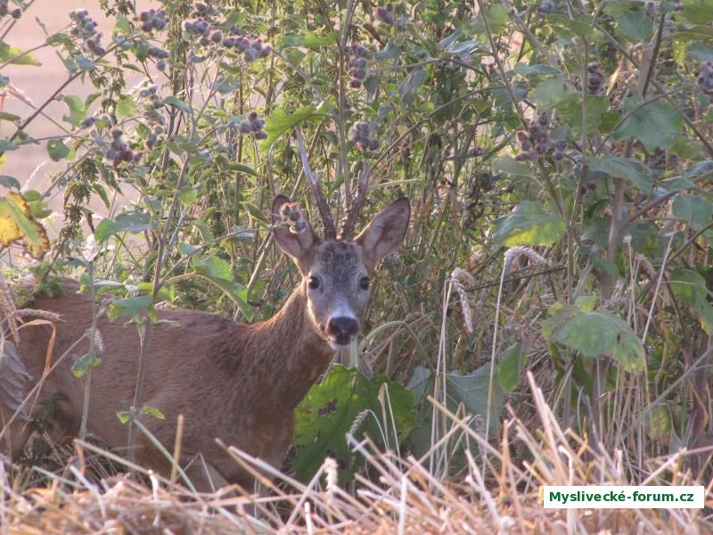 Srnec s uloveným parohem nad přední výsadou.