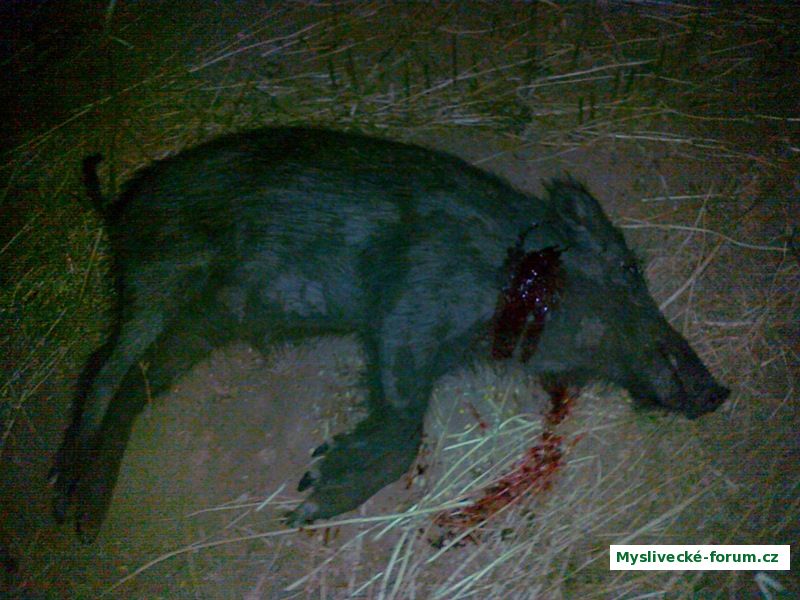 Tak jsem se u nás v polní honitbě konečně dočkal i já! :-) U nás je prase pořád "důvod" :-) ale o to víc máme drobné! Před cca 14dny jsem si udělal v pořadí druhý "průsek" v hořčici, protože u toho prvního u řepky v ječmeni prasata chodili nepravidelně a pak před 3 týdny přestali úplně :-( Po cca týdnu nový průsek černá objevila a i v těch největších vedrech (přes den klidně přes 34C) začala navštěvovat a to od pondělní noci. Chodila samozřejmě v noci, protože to je na SILNĚ frekventovaném místě kousek od cesty(příměstská honitba). Kvůli tomu úmornému vedru jsem já nechodil a oni přesto ano :-) Včera už se trochu ochladilo tak jsem šel ven i já! Výsledek vidíte na přidané fotce z nástřelu. Překvapilo mě, že kňourek 45kg měl vlhké běhy (pokud se nepotí jako já, tzn. jako prase!!) když voda je možná pár km vzdálená. Vím, že pár km pro prase je no problemo, ale v těch hicech mě to překvapilo o to víc. I když vím, že v tom poli je kaliště, tak nevím, v jakém je v tomto počasí stavu… Kus chodil sám i podle toho, jaké malé množství „lahůdek“ bral. Překvapilo mě, že v těchto vedrech vytahoval tak daleko do otevřené rozpálené krajiny, když to sakra že nebylo „prasečí“ počasí!! :-) Loňčák 45kg, stříleno na 20m za slecho (kvůli 1,5m vysoké hořčici okolo), Brno 500 7x65R/12/70, střela Norma Vulkán