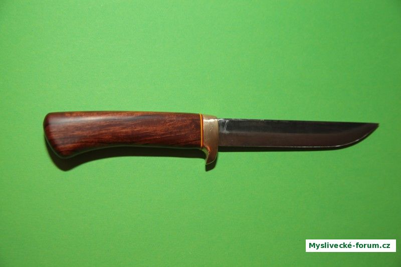 Dneska ráno jsem doma( mám týden dovolené) piloval a brousil zase pořádný kus mosazi. Když to všechno vyjde, bude zítra hotový jeden nový pro kamaráda. Je to Mora 150mm s mosaznou záštitou jako má tento na fotce, jen je patřičně robustnější. Zasazuji ho do parohu i s pučnicí. Vypadá to docela dobře, ale je s tím fůra práce. Jen než jsem našel vhodný kus parohu a potom to přizpůsobování, abych ten paroh nemusel moc násilnit. Snad se to povede a dám sem zase fotku. Do rubriky dnes napíšu jak jsem tento pokřtil. Zdar Karel