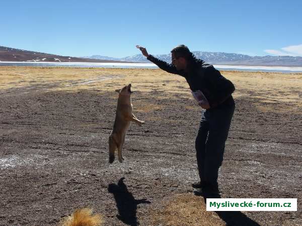 Švagr si hraje s liškou v poušti v Národním parku Nevado Tres Cruces v Chile.