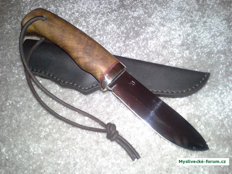Čepel z korozivzdorné oceli N690, tloušťky 3mm je 105mm dlouhá a 27mm široká. Kování z mosazi, rukojeť z červeného fíbru v kombinaci s dubovým dřevem. Rukojeť je napouštěná teakovým olejem s karnaubským voskem. K noži přísluší tulejové kožené pouzdro. (nůž je zatím volný, na prodej)