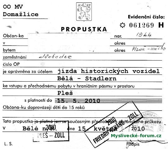 Původní propustky, použité komicky při jízdě historických vozidel k sousedům, ale v té době si ji občas vymodlil i někdo z lesníků za účelem lovu.