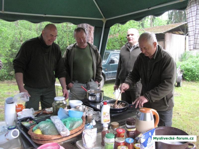 Zleva: Jirka Polák nakrájel špek od Edáčka, Jarda Miňha kontroluje jestli to jsou kostičky 1x1 cm , Olda Vopršal už je připravený s talířem a Bohoušek Dvořák už míchá špíček pod vajíčka .... a byly mňaminkové děkujeme za výbornou nedělní snídani ;-)