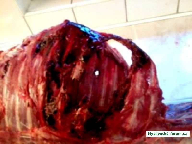 Takže popořádku, byť nekvalitní foto, ale je vidět, že vstřel prošel mezi žebry, tak nějak nechápu proč kule udělala na druhém žebru takovou paseku. Vysvětlení by bylo, že srnec byl starý alkoholik a měl tvrdá játra. No pro psa by to bylo, ale když se to dobře opere je z toho i dobrý vývar do guláše a pak to může zkonzumovat pes, ale opravdu to musí být pořádně očištěno, protože ani psovi nedělají dobře kovové střepiny zejména z olova. A jak píše Honza, když to odnese jen zadní půlka žebra z kterého se toho nedá moc udělat je škoda minimální a ta játra se dá oželet. Jak píše další Honza, staré SPCE mi to nedělalo, myslím že jsem již zde dával nějaké fotky, zkusím je dohledat a nebo je vložím do foto.