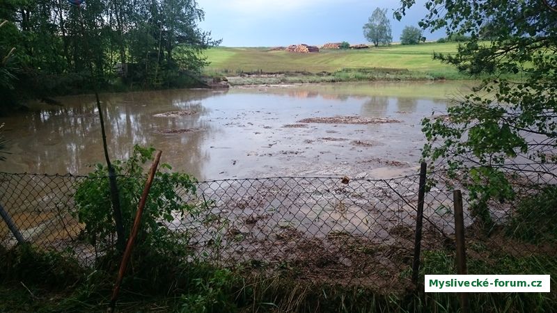 Brambory a stará kukuřice z pole nad rybníkem spolu s přívalem krup ucpaly odtok a voda šla přes hráz. Vzalo to kus zadní části hráze, ale ta bezpečně drží. Ještě že nepřiplavalo dříví uskladněné nad rybníkem.
