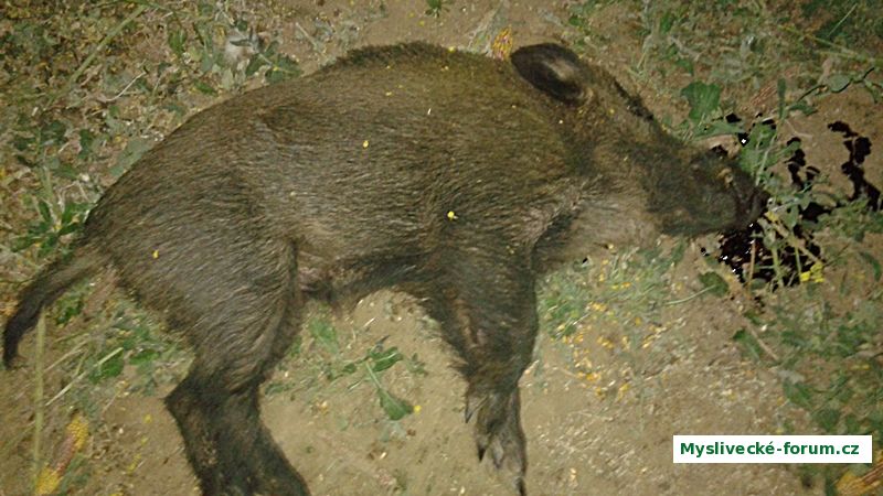 Lončák 48kg kňourek z 10.5.2016, ve 23,15 hod v řepce, na cca 30m na hlavu, vstřel pod pravým světlem, výstřel za levým slechem.