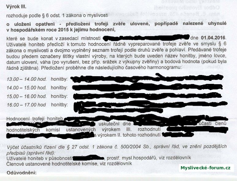 Část rozhodnutí SSM o konání chovatelské přehlídky - výrok o uložení opatření- předložení trofejí