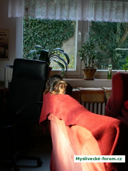 Oblíbené místo Brity 110 cm vysoko, odkud mne pozoruje, co peču (dnes tvarohový mřížkový koláč).
