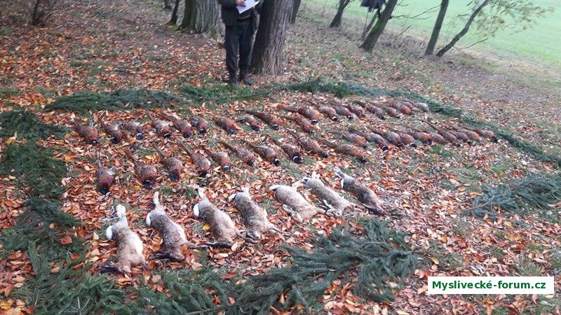 Tak počasí nám celkem vyšlo a výřad byl slušný - 40 bažantů a 7 zajíců. Vše divoká populace. Zajíc se lovil jen v jedné menší leči (vinohrad). Hony na zajíce nás ještě čekají :-)