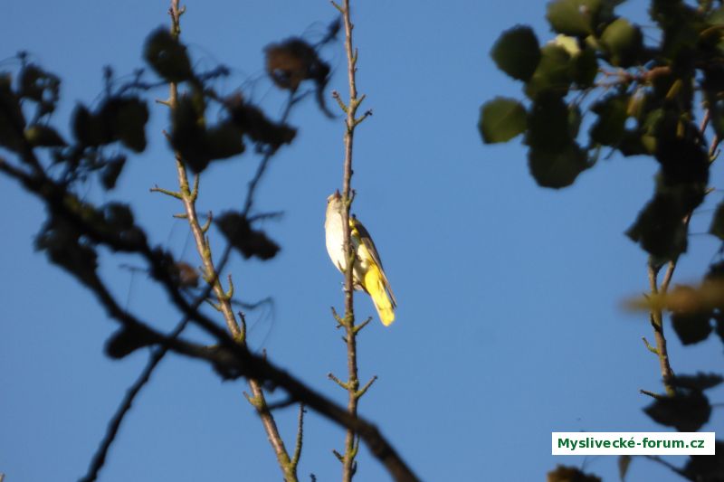 V létě, když jsem to fotil, tak jsem viděl asi pár, ten druhý kus byl schovaný v korunách stromů, tenhle byl mezi větvěmi vidět jen tak tak, ptáci zpívali mně nepovědomě a kupodivu se nesnažili rychle uletět, i když mě dobře viděli, což u ptactva není často vidět. Žluvu jsem naživo nikdy předtím neviděl ani neslyšel a na obrázcích je častěji ztvárněn samec, který přeci jen vypadá dost jinak.
