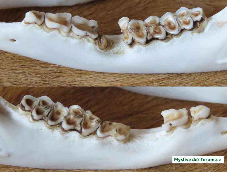 Levá M1 rozstřelená, pravá P3 vystřelená. Některé okraje zubů vpravo dole i nahoře po trhnutí čelistí bokem ještě odštípnuté.
