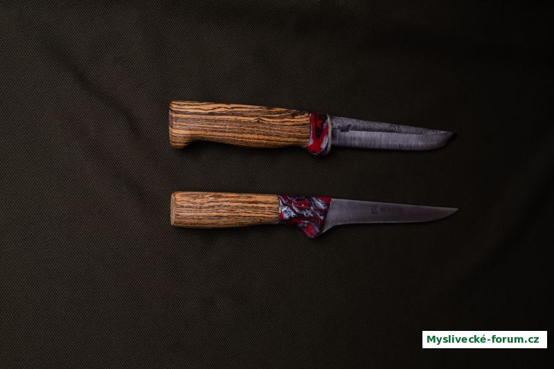 Ještě nejsou tzv. \"napulírované\", ale už jsou v podstatě na světě. Jeden lovecký 125mm Kuikka s alpakou, pryskyřicí Inlace a dřevem ovangkol. Ten je můj a bude se mnou jezdit do revíru. Druhý je Brusleto pro moji dceru do kuchyně, je to takový univerzální nůž s tenkou, 2mm čepelí a vhodný zejména na vykosťování.