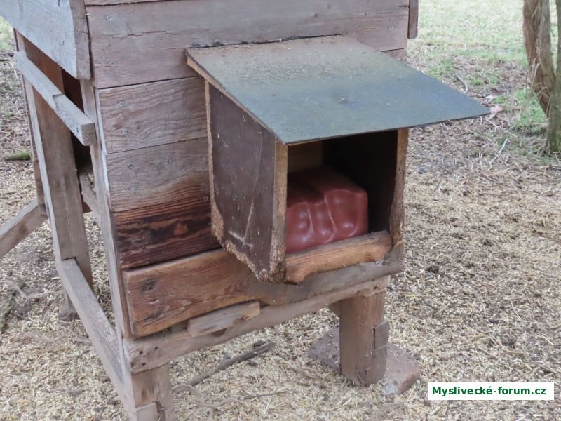 Jedno z našich slanisek na boku zásobníkového krmítka. Medikovanou sůl prý srnčí zásadně nebere (slyšel jsem) :-)