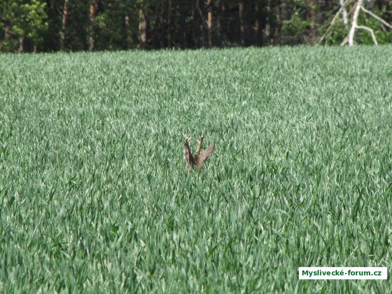 Včera ležel v pšenici jako každý den před kazatelnou a pač foukalo a obilí šustilo, dostal jsem se poměrně blízko. Levá přední výsada je hodně dlouhá, tak se tento srnec dobře identifikuje :-)